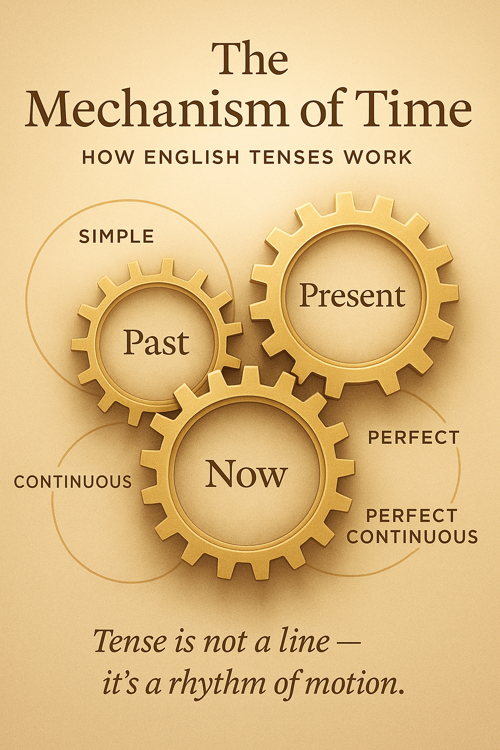 English organizes time through verbs. Each tense acts like a gear that connects past, present, and future. These gears don’t turn separately — they mesh, influencing each other’s motion.