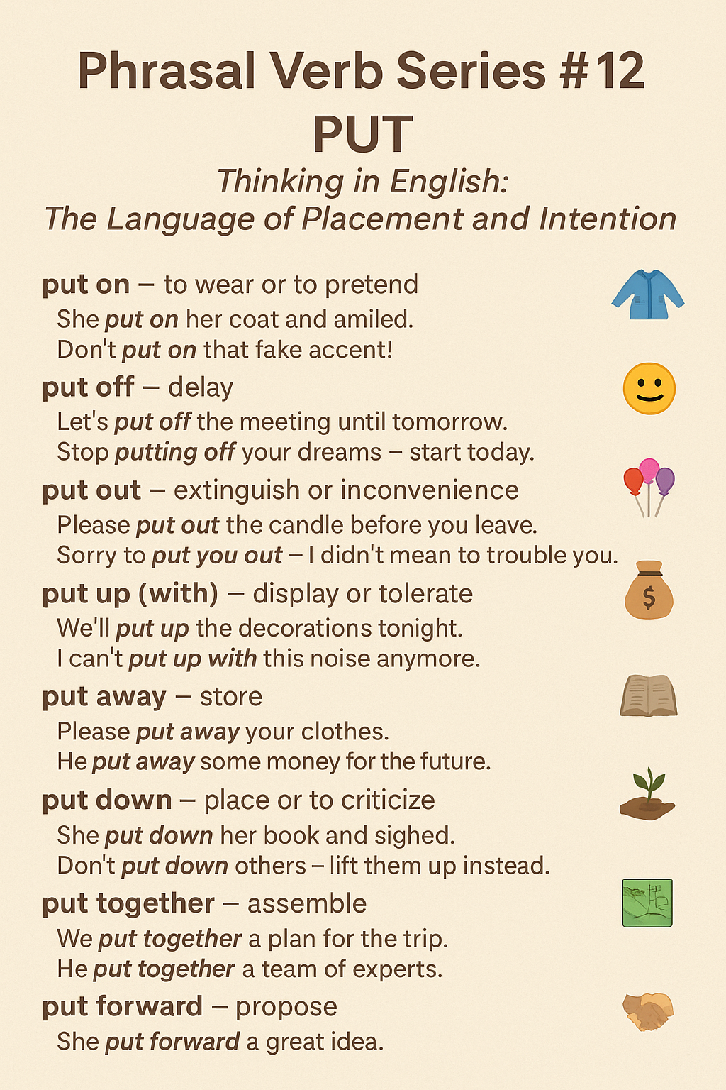 👉 Feel it: “put on” = adding an outer layer — physically or emotionally.