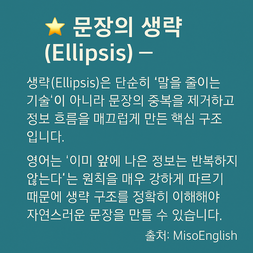 영어는 ‘이미 앞에 나온 정보는 반복하지 않는다’는 원칙을 매우 강하게 따르기 때문에 생략 구조를 정확히 이해해야 자연스러운 문장을 만들 수 있습니다.
