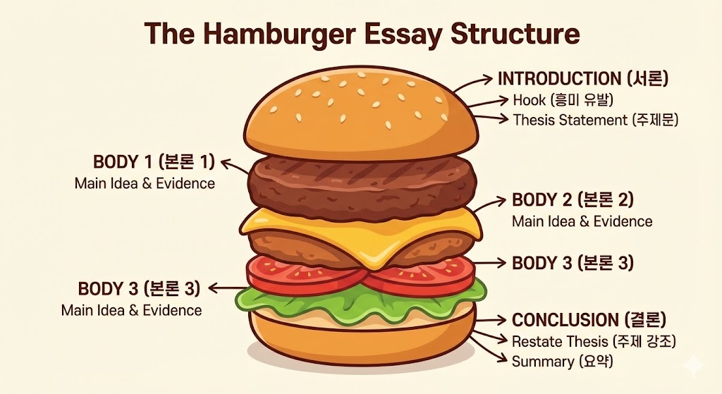 오늘은 영어 글쓰기의 기본 중의 기본, **'5문단 에세이(5-Paragraph Essay)'**의 구조를 맛있는 햄버거에 비유해 설명해 드립니다.