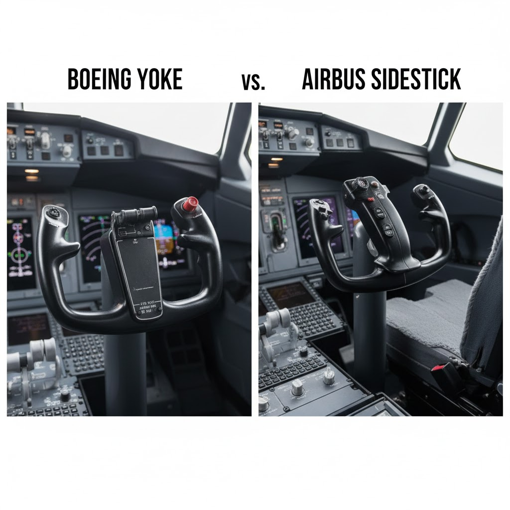 Boeing (전통의 힘): 자동차 핸들처럼 생긴 거대한 **'요크(Yoke)'**가 있습니다. "비행기는 파일럿이 힘으로 통제해야 한다"는 미국식 철학입니다.