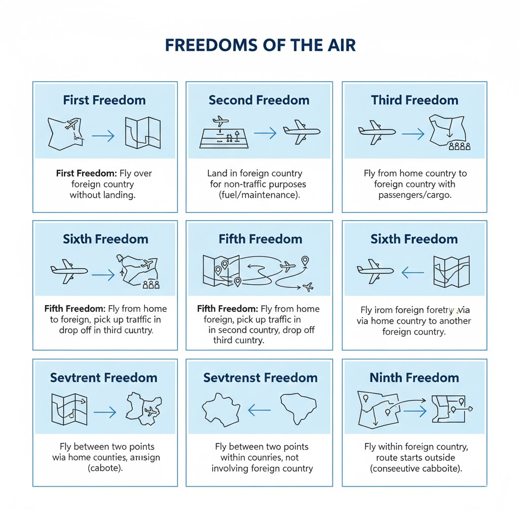 - 해설: 1자유부터 9자유까지 있으며, 이 권한(특히 제5자유 이원권)이 어떻게 설정되느냐에 따라 A380 같은 초대형기가 특정 노선에서 수익을 낼 수 있을지가 결정됩니다. 예를 들어 에미레이트 항공이 뉴욕-밀라노 구간 승객을 태울 수 있는 것은 바로 이 '하늘의 자유' 덕분입니다.