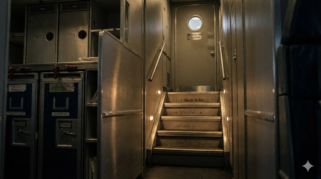The entrance looks like a lavatory door but is equipped with a keypad (door lock), or sometimes it's a hidden narrow staircase tucked away in the corner of a galley. Passengers often mistake it for a cleaning supply closet and walk right past it.