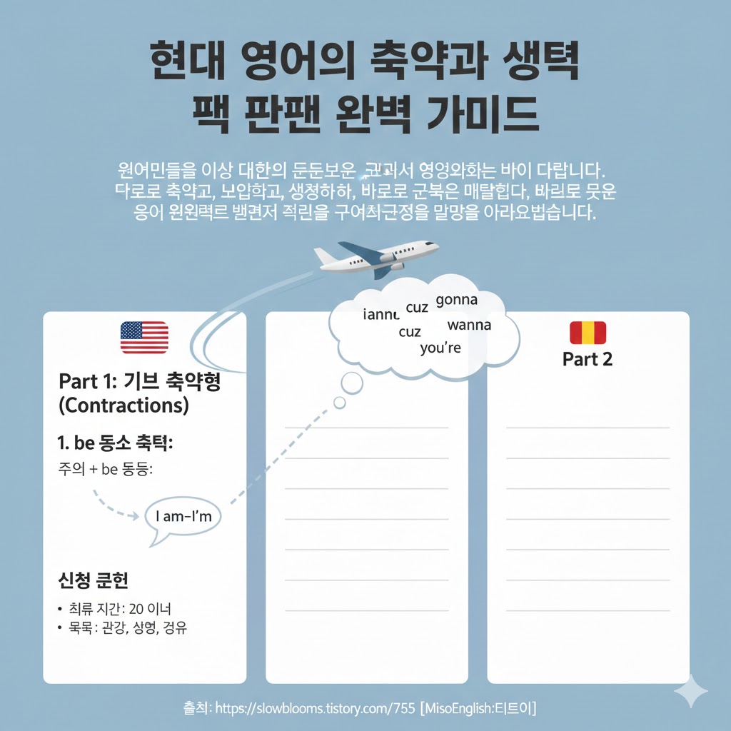 원어민들의 일상 대화를 들어보면 교과서 영어와는 많이 다릅니다. 단어를 축약하고, 불필요한 부분을 생략하며, 빠르고 자연스럽게 말합니다. 오늘은 현대 영어에서 자주 사용되는 축약과 생략 패턴들을 배워서 진짜 원어민처럼 자연스러운 구어체를 구사하는 방법을 알아보겠습니다.