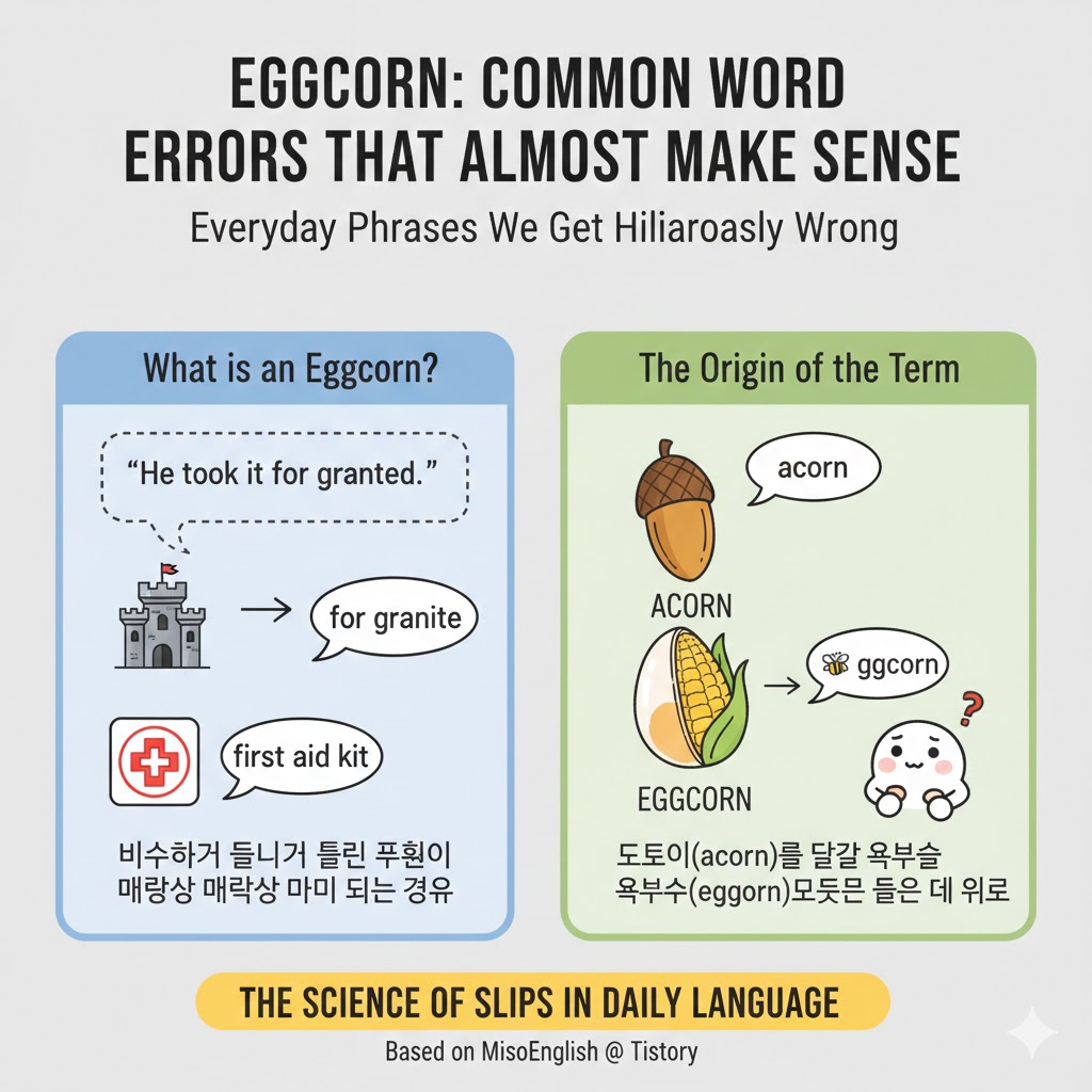 Eggcorn은 비슷하게 들리는 단어나 구절로 대체되는 언어적 오류입니다. 틀린 표현이지만 맥락상 말이 되는 것처럼 보이는 것이 특징입니다. Mondegreen이 주로 노래나 시를 들을 때 발생하는 것과 달리, eggcorn은 일상 대화나 글쓰기에서 발생합니다. 이 용어 자체도 누군가가 "acorn(도토리)"을 "eggcorn(달걀 옥수수)"으로 잘못 들은 데서 유래했습니다. 도토리가 달걀 모양이고 참나무에서 나온다고 생각하면 나름 말이 되는 것 같기도 하죠.