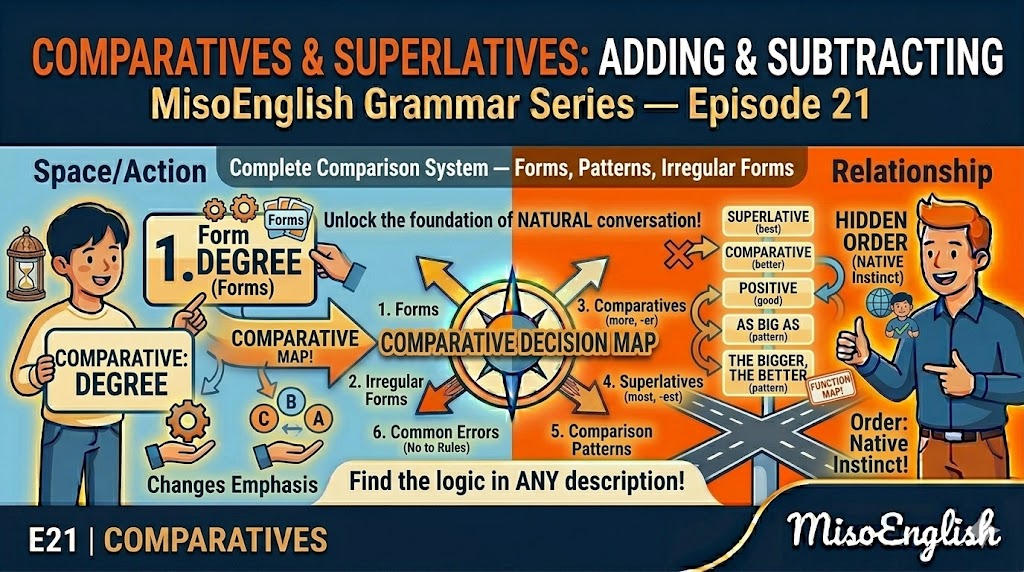 English has a full system for expressing degree and comparison — and it's more varied than most learners realize. This episode maps it out completely: how to form comparatives and superlatives, how to use them in sentences, and the patterns that make comparisons vivid and precise.